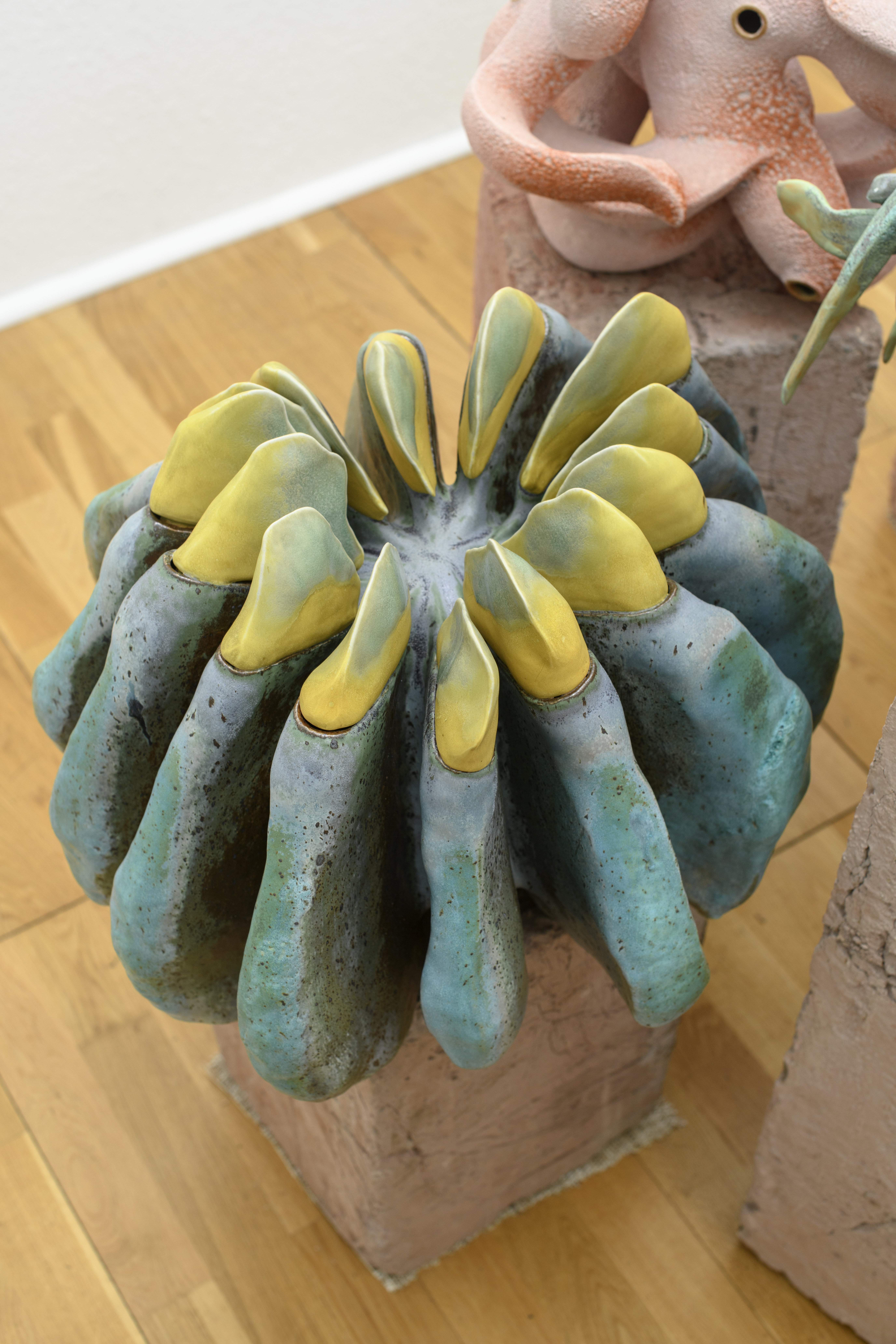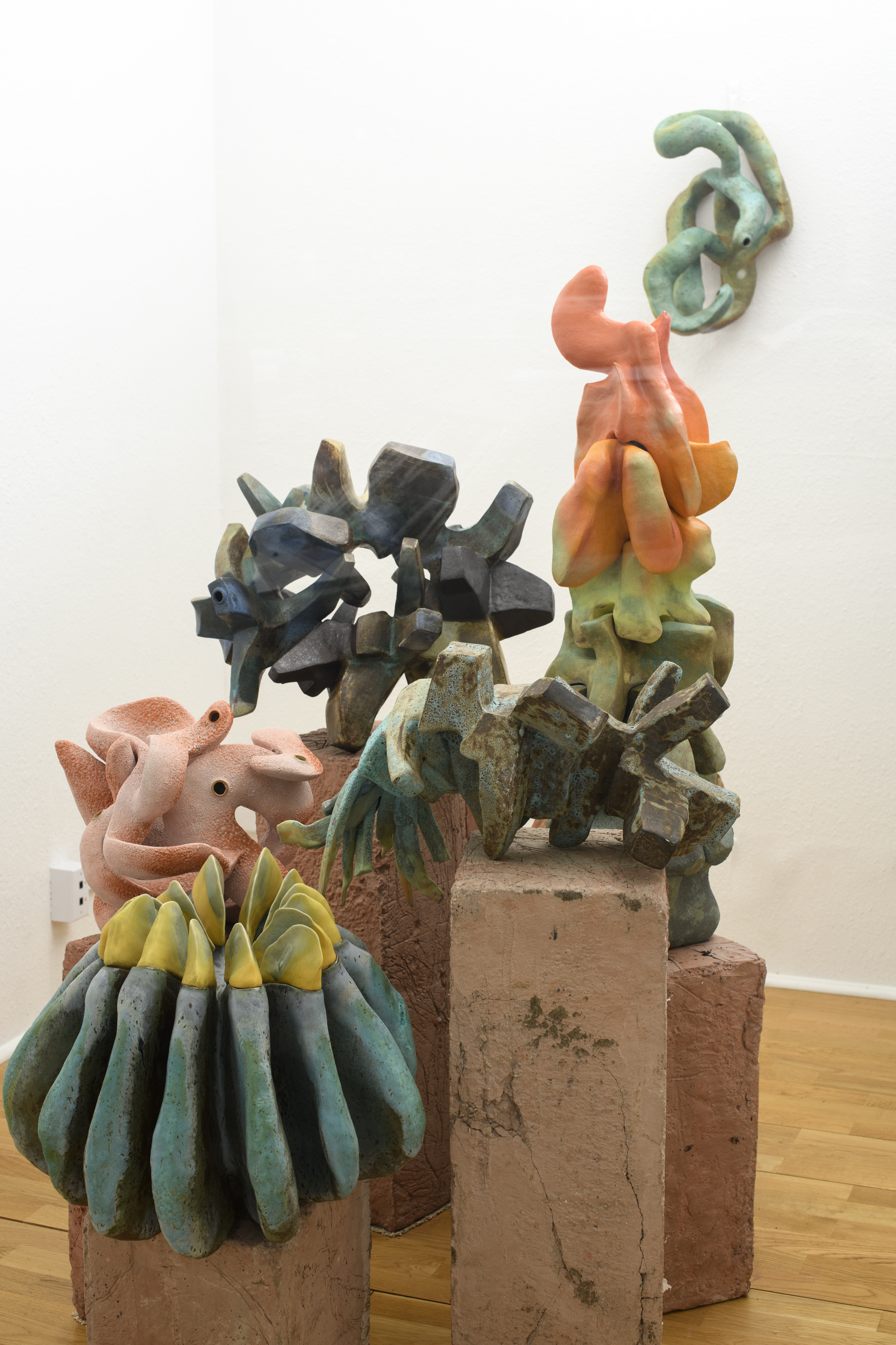 Emergence is when complex patterns arise from simpler parts, as seen in nature and human-made systems, such as the growth of coral reefs, the branching of trees, the formation of weather patterns, or the evolution of cities. Emergence is not the result of a single force, but a collaboration and conversation between materials, time, and environment. The exhibition presents a series of interlocking ceramic sculptures. While the geometry of the work might be rudimentary it's the combinations of these forms and their relation to one another where complexity emerges. Vibrant oranges and muted greens suggest the slow patina of decay and renewal, like flesh giving way to mineral. The clay remembers pressure, and the kiln’s unpredictable environment coaxes out color and texture, blurring the line between the organic and the elemental. |